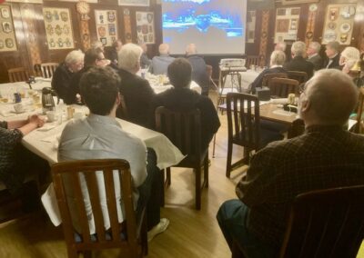 Efter måltiden fortsatte vår medlem Anders Welin sin presentation av filmer av ”Marinen 500 år” vilken informerade om katastrofen i Hårsfjärden 1941 då jagarna Göteborg, Klas Uggla och Klas Horn av fortfarande okänd orsak sprängdes och sjönk. Det som framkom vid utredningen 1941 är hemligstämplat till 2041.