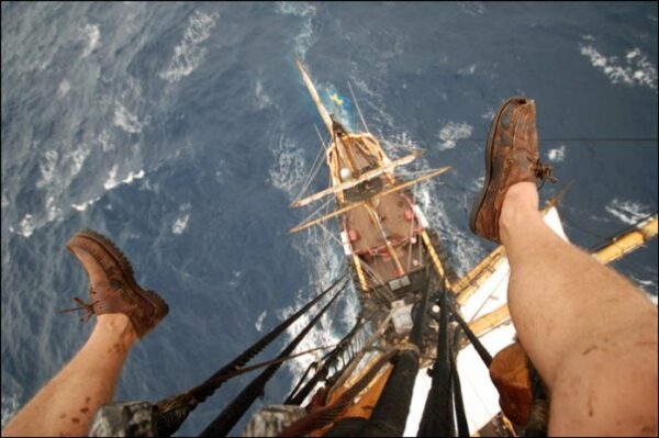 Linus Karlsson, då 20 år, i märskorgen i Götheborg,högst upp i masten.