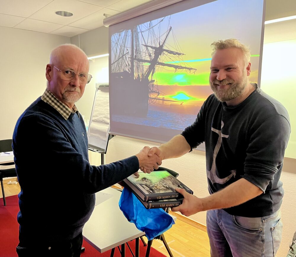 sin resa med ostindiefararen Götheborg till Kina. Linus Karlsson fick ta emot applåder av lyssnarna (ca 25 personer) och ett bokverk ( Marinen 500 år ) av ordf Sven Johansson.