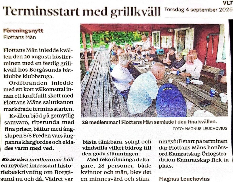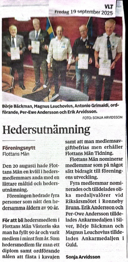 Två notiser från senaste arrangemang finns införda i Västmanlands Läns Tidning. Terminstart och hedersutnämnande och medaljutdelning. Flottans Män tackar våra skribenter.